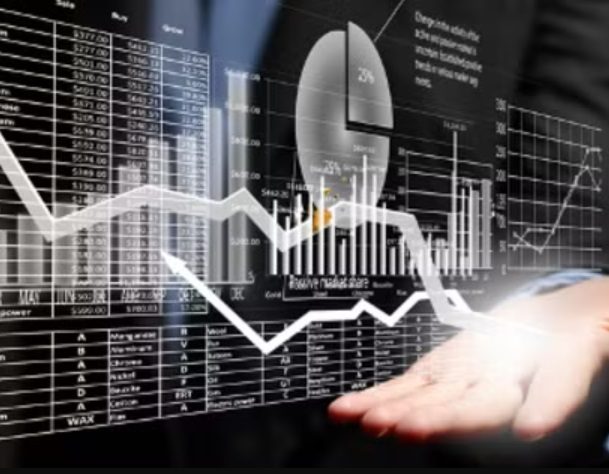 Futuristic dashboard with trend lines, forecast charts, and AI icons.